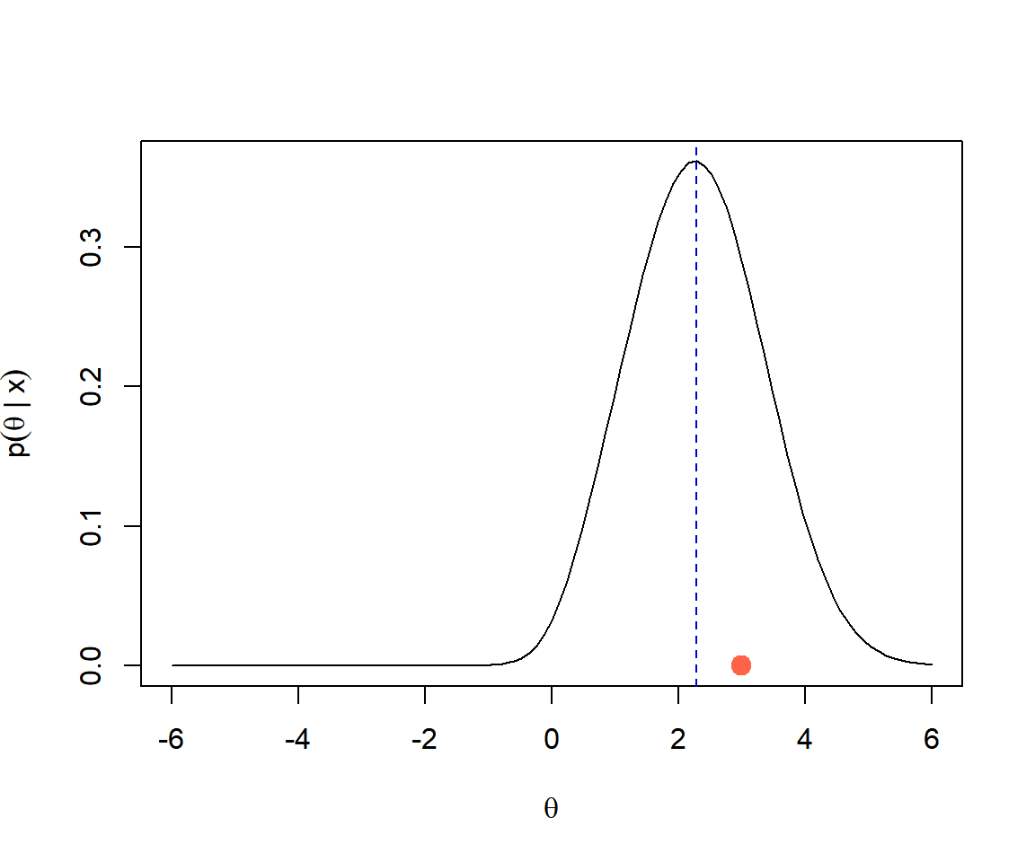 Del resultado anterior tenemos que \(E(\theta | datos) = 2.2869159\). En la siguiente figura se muestra la distribución a posteriori, la única observación \(x=3\) (punto en color rojo) y la media de la distribución a posteriori (línea azul a trazos).